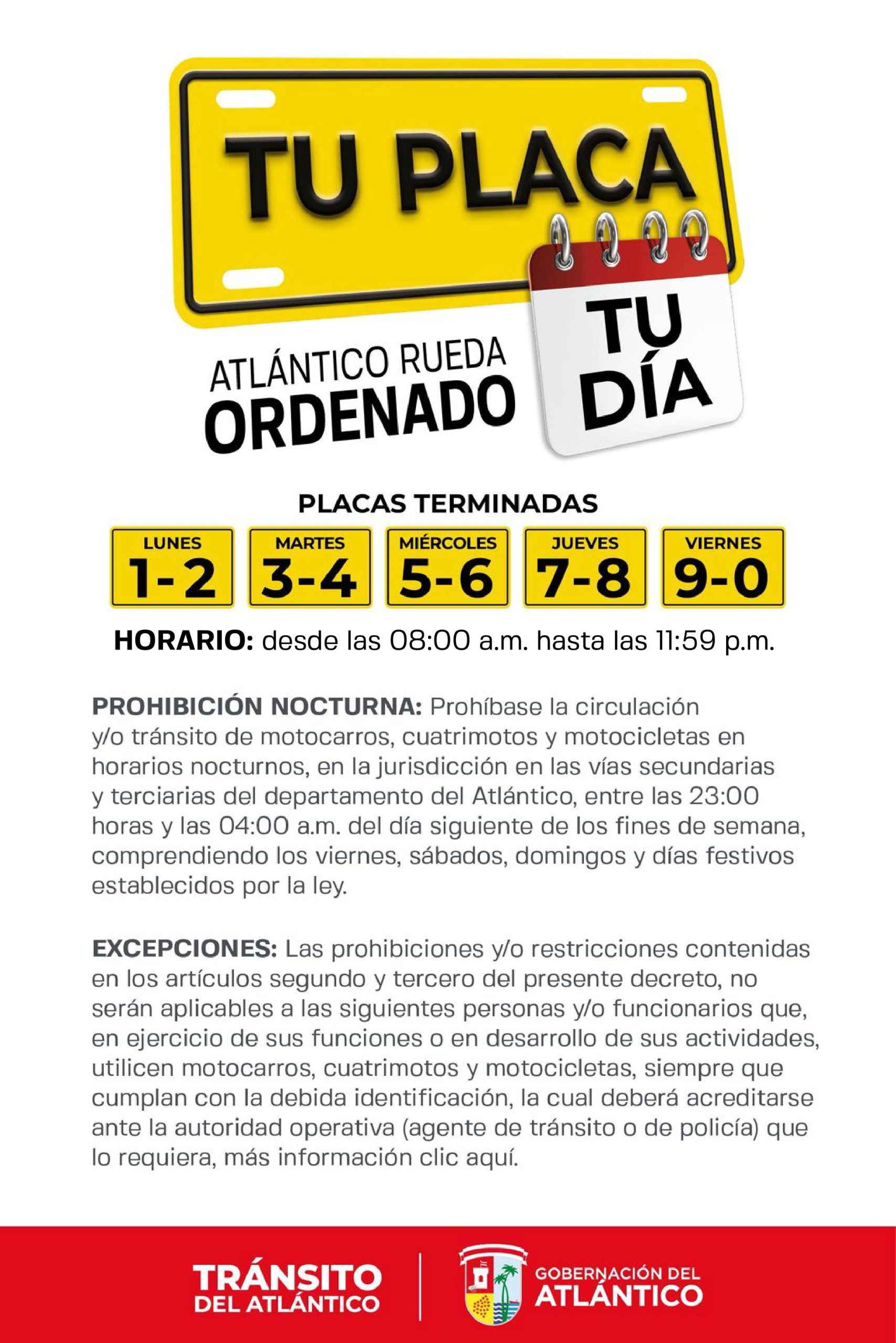 Pico y placa (restricción diurna) para motocarros, cuatrimotos y motocicletas, en el horario de 08:00 a. m. a 11:59 p. m., distribuidos por el número final de la placa durante los días de semana, así: lunes 1 y 2; martes 3 y 4; miércoles 5 y 6; jueves 7 y 8; viernes 9 y 0.